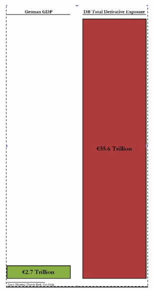 Das deutsche Bruttoinlandsprodukt im Verhältnis zu den aus Derivaten resultierenden Risiken der Deutschen Bank. Quelle: Zerohedge>