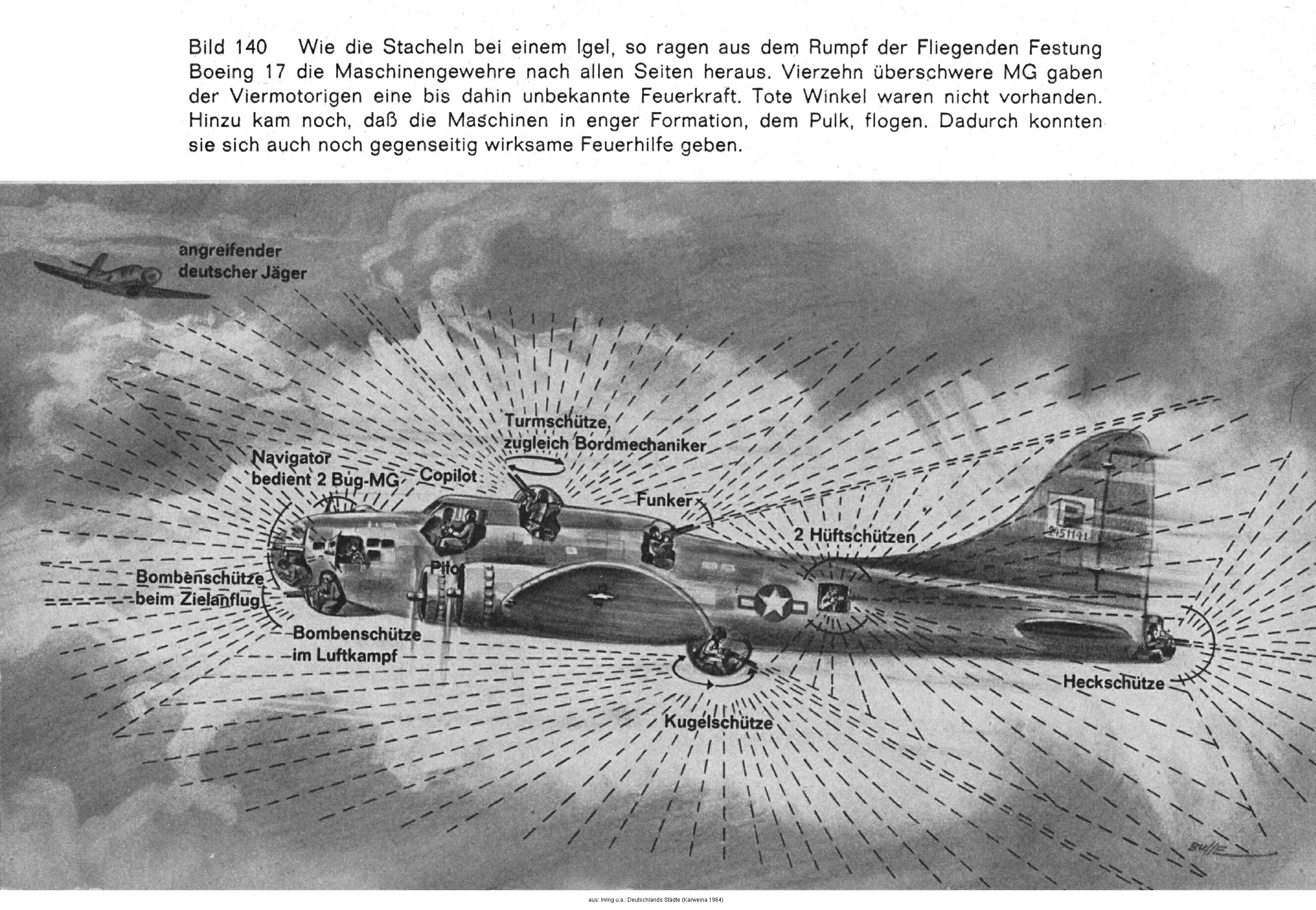 Wie die Stacheln bei einem Igel, so ragen aus dem Rumpf der Fliegenden Festung Boeing 17 die Maschinengewehre nach allen Seiten heraus. Vierzehn überschwere MG gaben der Viermotorigen eine bis dahin unbekannte Feuerkraft. Tote Winkel waren nicht vorhanden. Hinzu kam noch, dass die Maschinen in enger Formation, dem Pulk, flogen. Dadurch konnten sie sich auch noch gegenseitig wirksame Feuerhilfe geben.
