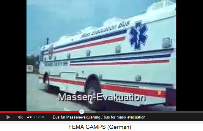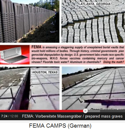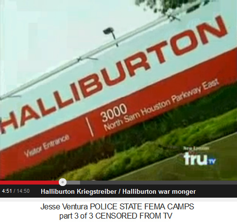 Halliburton is making the hell with the world, also with the "U.S.A.", all the time it's Halliburton (4min.39sec.). There are "Homeland Security Contracts KBR to build detention centers in the US" (4min.42sec.). And the camps are from FEMA, the emergency board for crisis - is organizing mass death (4min.58sec.) - "is ready to round us up" (5min.1sec.).