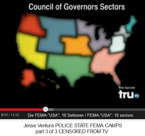 Jesse Ventura: FEMA has created 10 regions of "USA" (5min.5sec.) and they match almost perfectly with the council of governors sectors (5min.9sec.). This seems all to be a preparation for martial law (5min.16sec.). And just in Georgia the mass of coffin is prepared "where the center for disease control is based" (5min.23sec.).