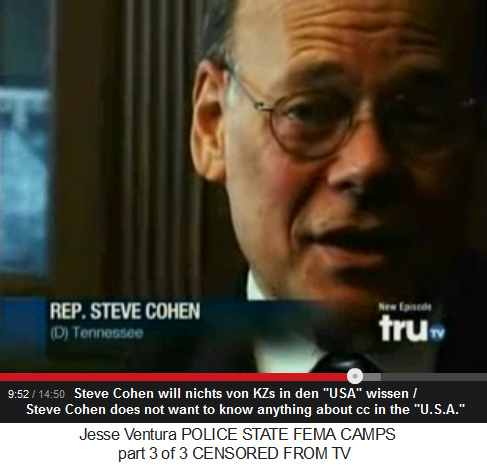 "Congressmen Steve Cohen [is also a Jewish Zionist name] of Tennessee had agreed to talk about the bill" (9min.36sec.). The question why are these camps built for what purpose are they to use? (9min.50sec.) - Steve Cohen, a Democrat from Tennessee: "Well we wouldn't because it's just a figment of some people who are concerned about maybe Martians or creatures who are thinking that there are such camps." (10min.4sec.)