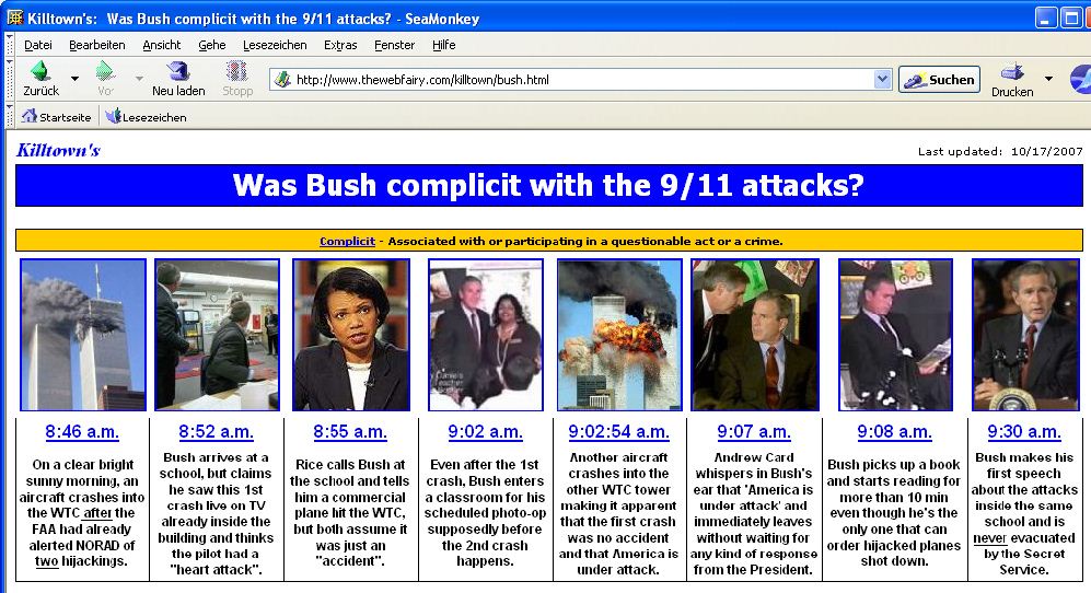Das "Weisse Haus" und die Verbrecherregierung Bush manipulieren die Öffentlichkeit und schweigen sich ins Grab, bis die Freimaurer-Korruption und das Defizit der "USA" von sich aus den Regierungssturz bzw. den Zusammenbruch der "USA" (der Verunreinigten Staaten) einleiten. Der 11. September 2001 war ein Massenmord der Bush-Regierung, und das Morden geht in den Kriegen weiter, bis die "USA" untergeht].