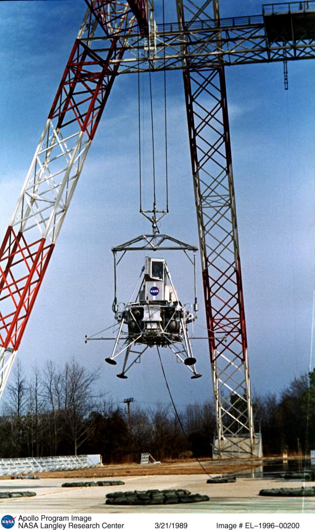 Grúa lunar en Langley: Un aparato lunar ("Lunar Landing Vehicle") con una cabina del piloto esquinado está colgando con la cuerda. Foto de la NASA no. EL-1996-00200
