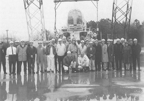 Atmosferonauta Neil Armstrong (mitad) con todo el equipo de la grúa lunar delante del aparato lunar, marzo 1967, foto de la NASA no. L-67-1697. (http://history.nasa.gov/SP-4308/ch11.htm)