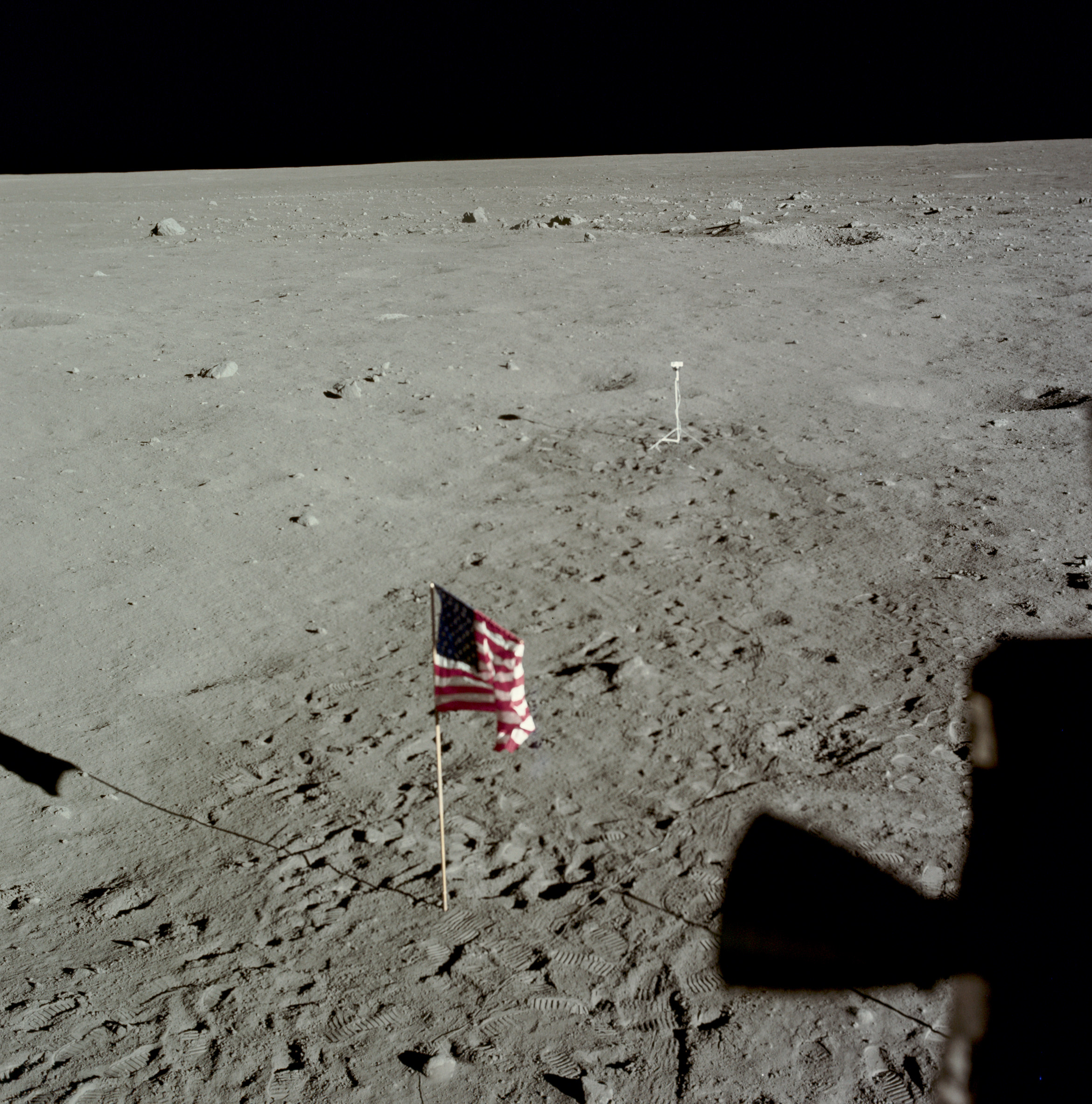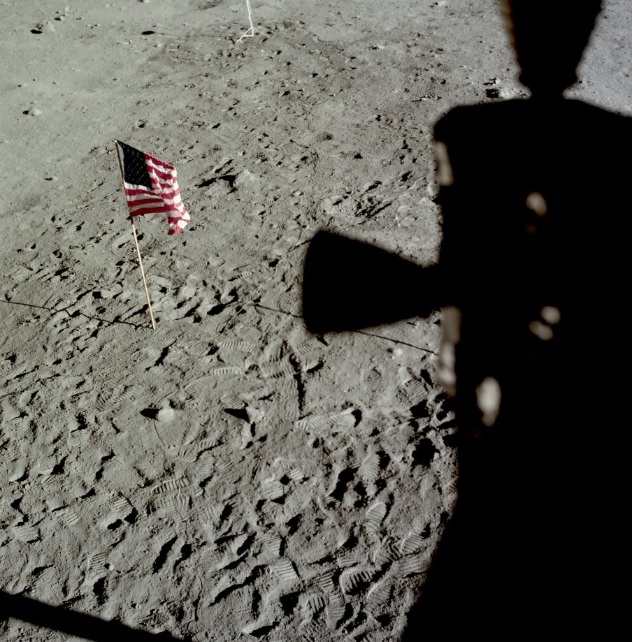 lunar", pisadas, y la sombra de la bandera