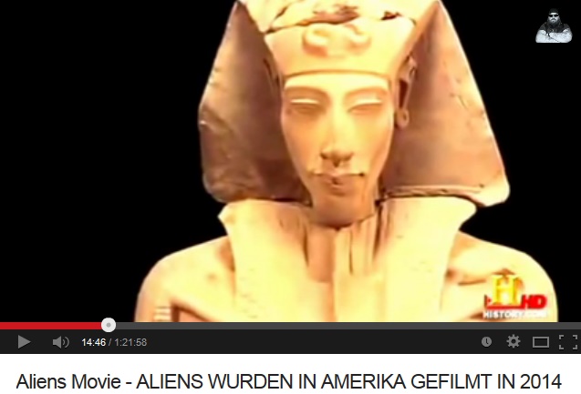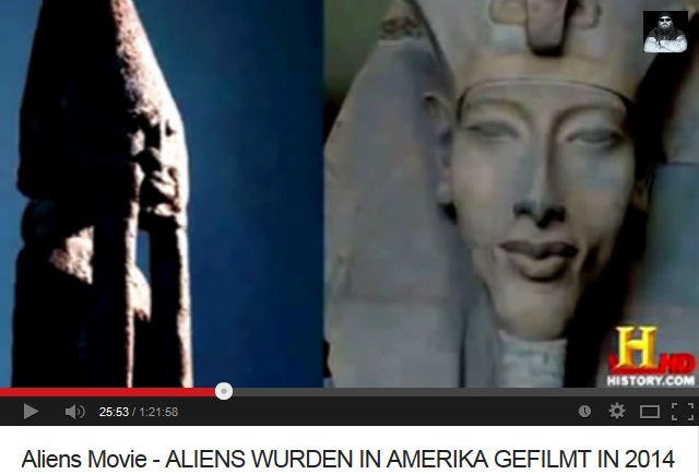 "Der verlängerte Hinterkopf ist ein faszinierendes Detail in alten, ägyptischen Darstellungen und in der Darstellung eines Pharaos, der höchst umstritten ist." (11min.50sek.) - "Hat er vielleicht sein Äusseres extraterrestrischen Besuchern angepasst?" (11min.56sek.) - "Oder gibt es noch eine viel gewagtere Erklärung? War der Pharao selbst ein Ausserirdischer?" (12min.2sek.)