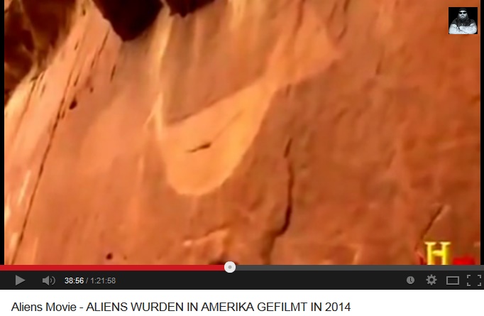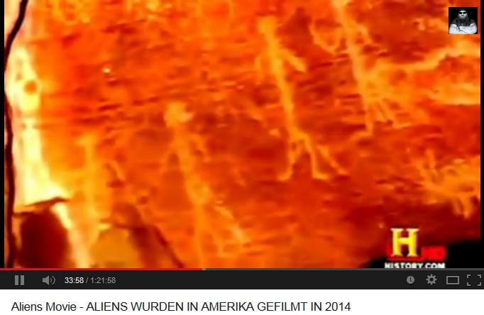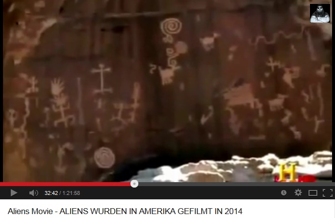 Sprecher: "Man nimmt an, dass diese Petroglyphen 1200 vor Christus entstanden sind. Doch sie scheinen moderne Raumfahrer und ihre Sternenvehikel abzubilden." (34min.7sek.) -