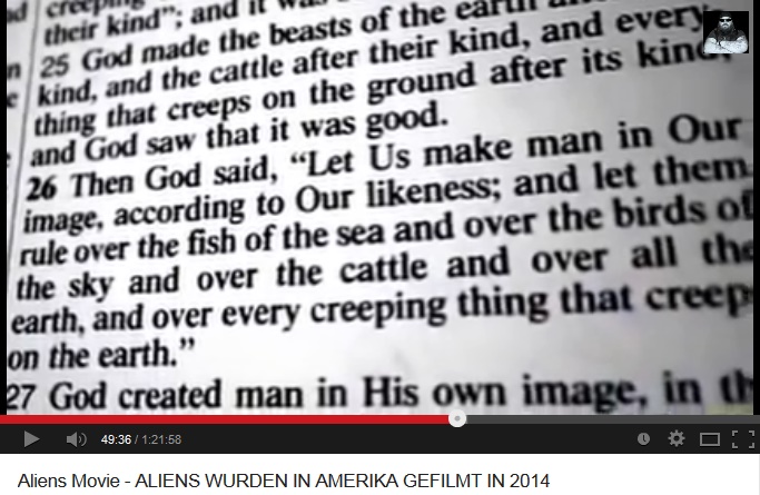 Sprecher: "Aber zeigt die Bibel mit ihren Schilderungen wirklich, dass die Erde im Verlauf der Geschichte von Ausserirdischen besucht wurde?" (50min.36sek.)
