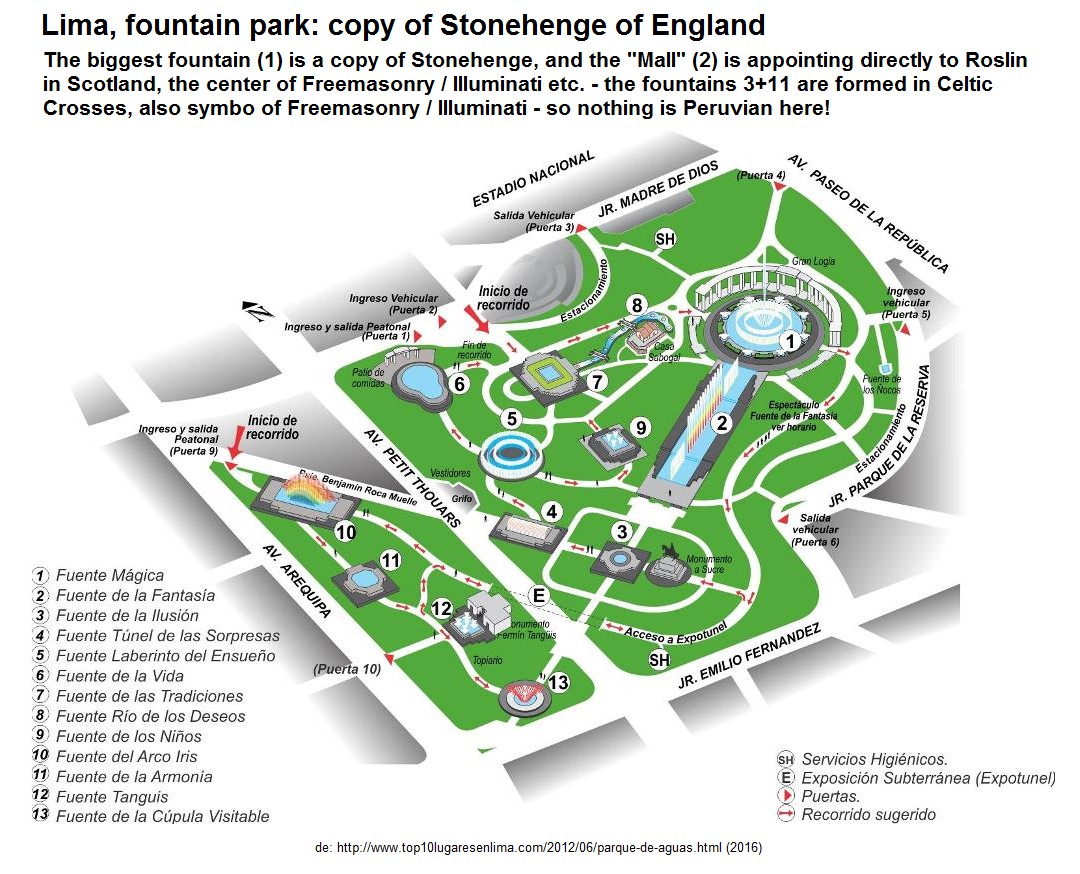 In Lima a Stonehenge copy can be found in the Fountain Park "Park of the Reserve" ("Parque de la Reserva")["Park of the Reserve" in Lima (Wikipedia)], see this Stonehenge copy in Lima in google maps["Park of the Reserve" in Lima with a Stonehgne copy on google maps, coordinates -12.0709454,-77.0362183,640m/]. The Stonehenge circle is called "Magic Fountain" ("Fuente Mágica") and is a giant fountain with fountain plays for everybody. The added "Mall" being called "Magic Water Circuit" ("Circuito Mágico del Agua") is a giant fountain of about 100m of length where fountain plays with colored lights and music are going on and nobody is getting aware that this "Mall" is a pointing directly to satanic Free Mason center Roslin in Scotland (!). With google earth one can control it: the "Mall" is pointing directly to Roslin.