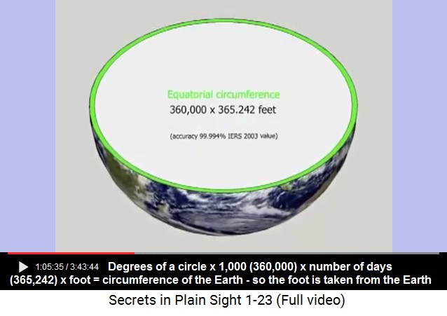 Thus: 1 foot x 360º (degrees of the circle) x 365.242 (number of days in a year) x 1,000 = Earth's circumference (1h5min.38sec.).